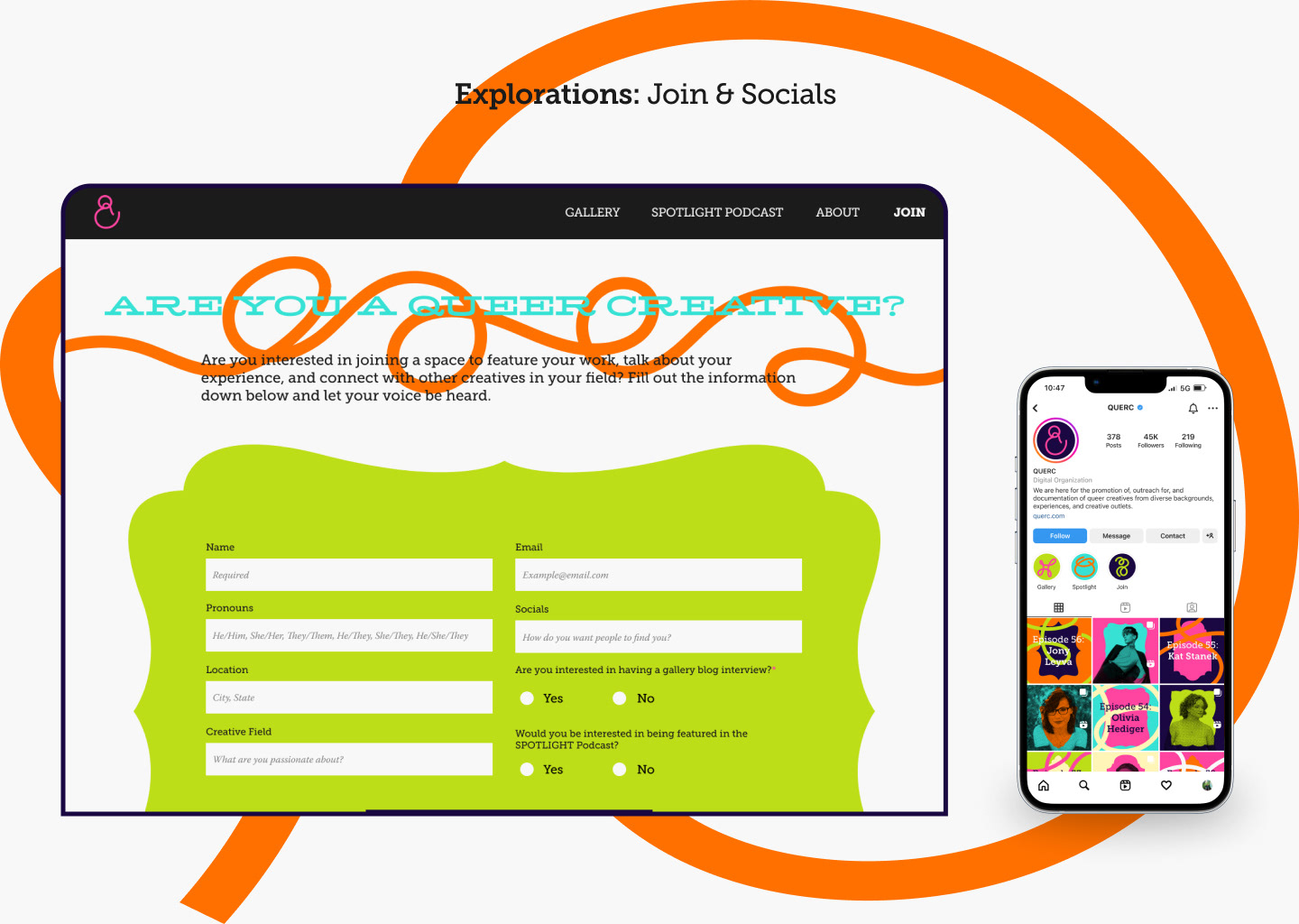 One of QUERC's priorities is to be accessible, allowing anyone to look or research for specific queer creatives. Additionally, QUERC prioritizes creatives' voices and interactive conversations. Initially, a website container was selected for accessibility, containing tools of an archival blog and podcast. With more development, additional features of joining QUERC and a social media presence were explored to encourage interactions between queer creatives and the audience.